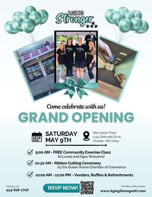 Ribbon Cutting and Grand Opening - Aging Stronger Date and Time Saturday May 9, 2026 9:00 AM - 12:00 PM EDT Location 116 South Piney Road Suite 204B Chester, MD 21619 Ribbon Cutting and Grand Opening - Ag... Set a Reminder Enter your email address below to receive a reminder message. Email address Select the amount of Days before the event -- Select Days Before Event -- 1 Day 2 Days 3 Days 1 Week Captcha Validation Please complete the Captcha Submit Description 9-10 AM FREE community exercise class 10 AM Vendors, raffles and light refreshments 10:30 AM Ribbon Cutting Images Gallery Image × Set a Reminder Enter your email address below to receive a reminder message. Email address Select the amount of Days before the event -- Select Days Before Event -- 1 Day 2 Days 3 Days 1 Week Captcha Validation Please complete the Captcha Submit Share × Print Email Add to Calendar Facebook Twitter LinkedIn Tell a Friend × Select Calendar Type × Google Yahoo iCal (Outlook, Apple, or other)